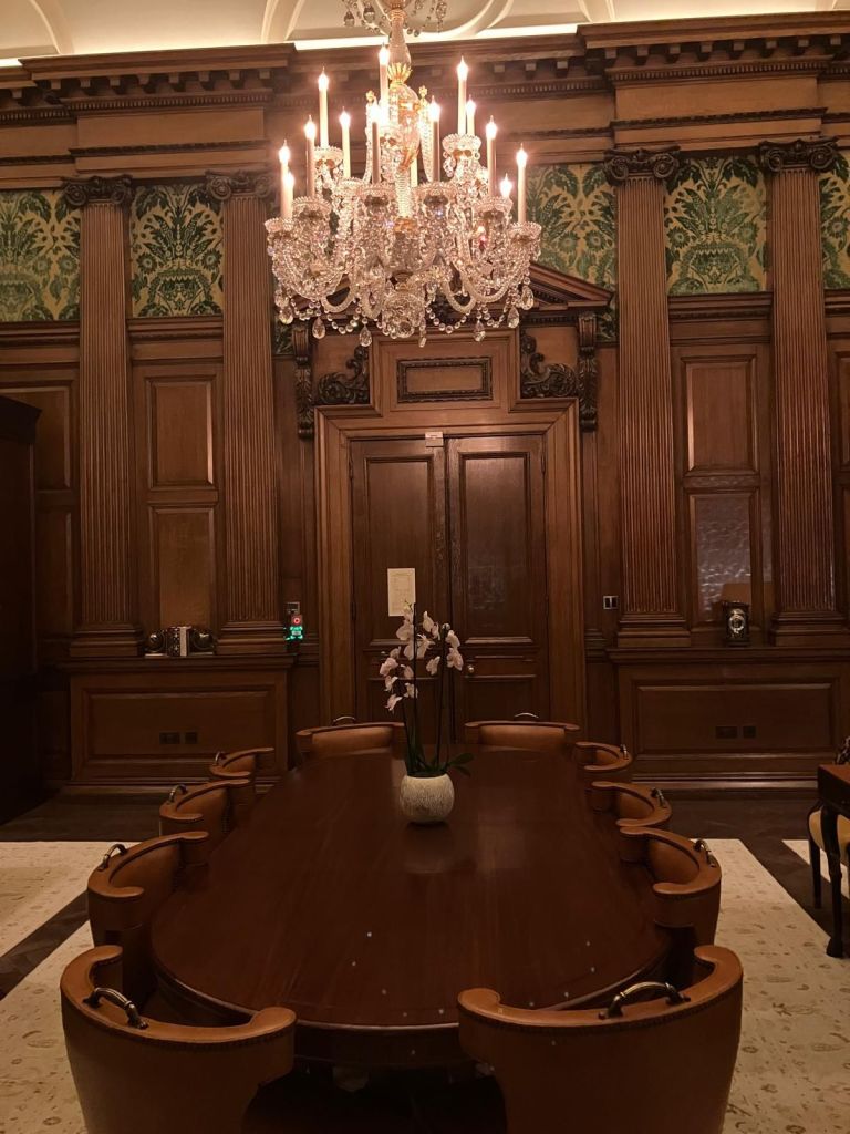Siobhan has a cousin who works at the Raffles Hotel, one of the nicest hotels in London. It used to be the Old War Office. It is also referred to as the OWO to commemorate its historical significance. It is in the neighborhood of Buckingham Palace, Scotland Yard, and 10 Downing Street. He treated us to a tour of the hotel, which is stunning in every way. He showed us the Churchill Suite. This is the very room where world leaders met to plan the D-Day assault at Normandy, France. Also, the room where heated arguments took place about who would lead this assault. Someone actually threw a chair across the table at General Eisenhower in this room. The chair missed the General but hit another gentleman, landing him in the hospital for two weeks. You could feel the history in the room. Take a look.
